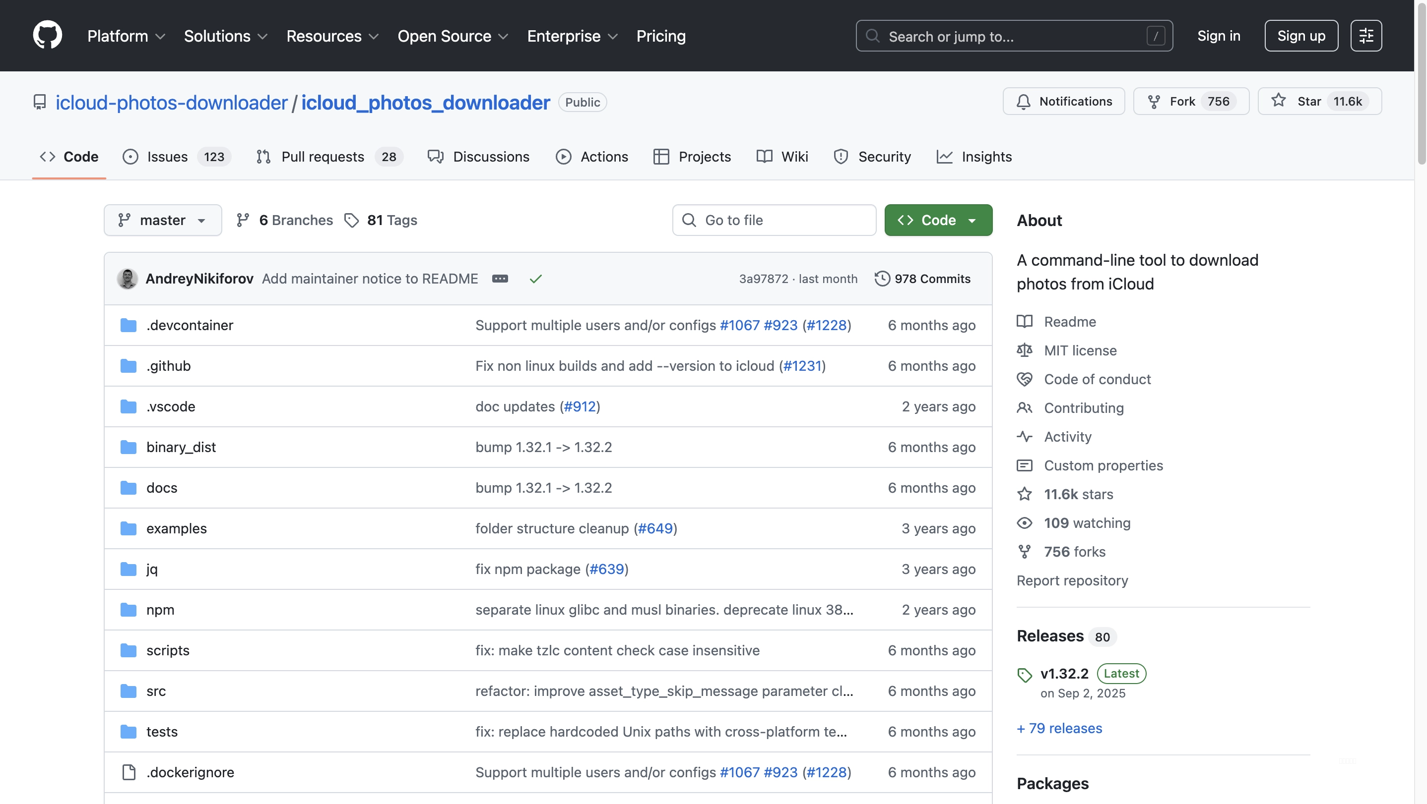 icloud_photos_downloader是一个由社区维护的跨平台命令行工具,用来把你的icloud照片库里的全部照片和视频下载到本地,支持linux,windows,macOS,还有一些nas设备,支持多种的操作,包括像copy,sync,move,等还可以提供自动去重和断点检测的能力,相对来说比较实用。