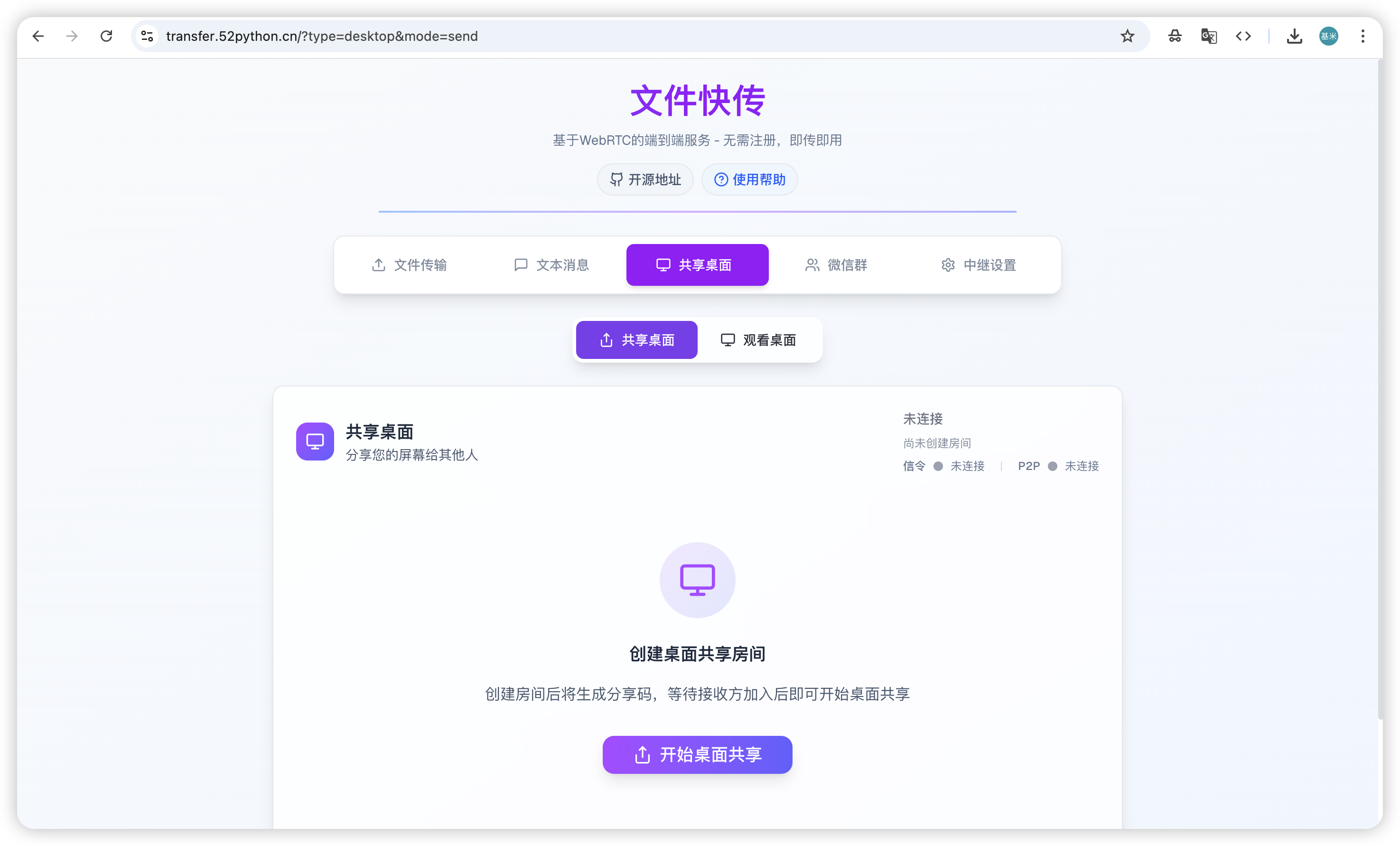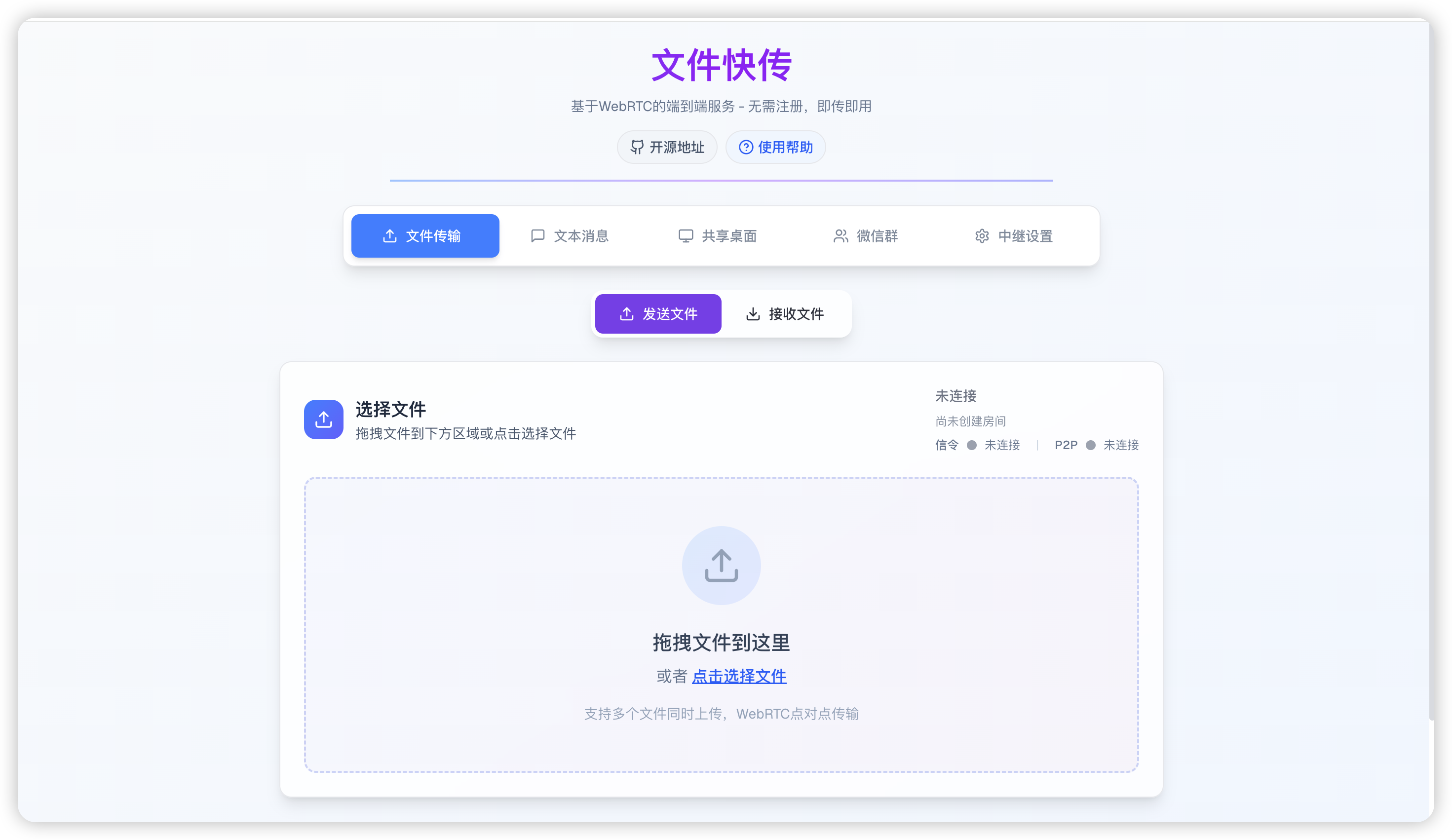 P2P 直连传输:通过 WebRTC 技术建立设备间直接连接,文件、文本或屏幕共享数据均不经过服务器中转,确保隐私安全。