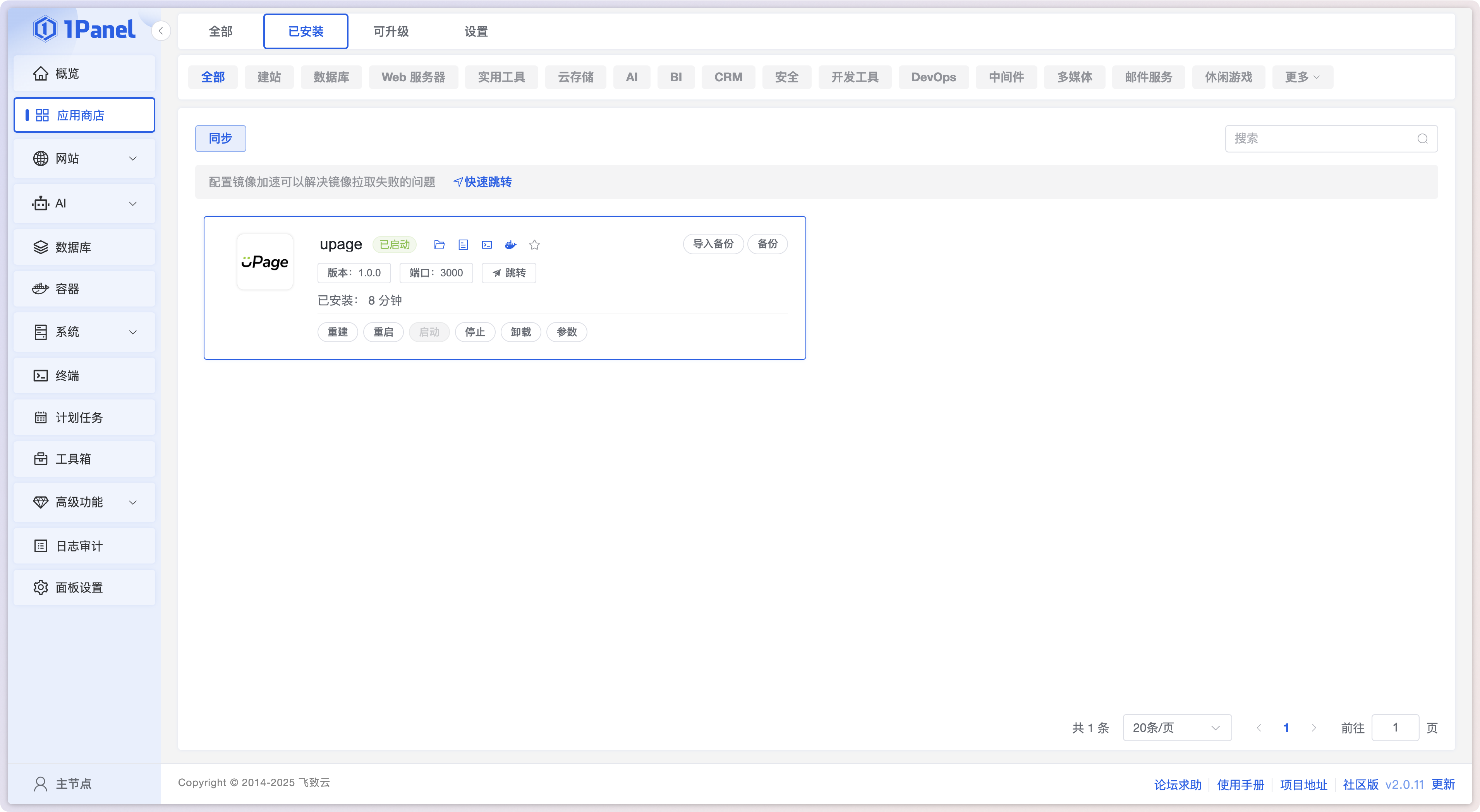 安装完成后,可以看到刚刚安装的 UPage 应用已经变为 已启动 状态。