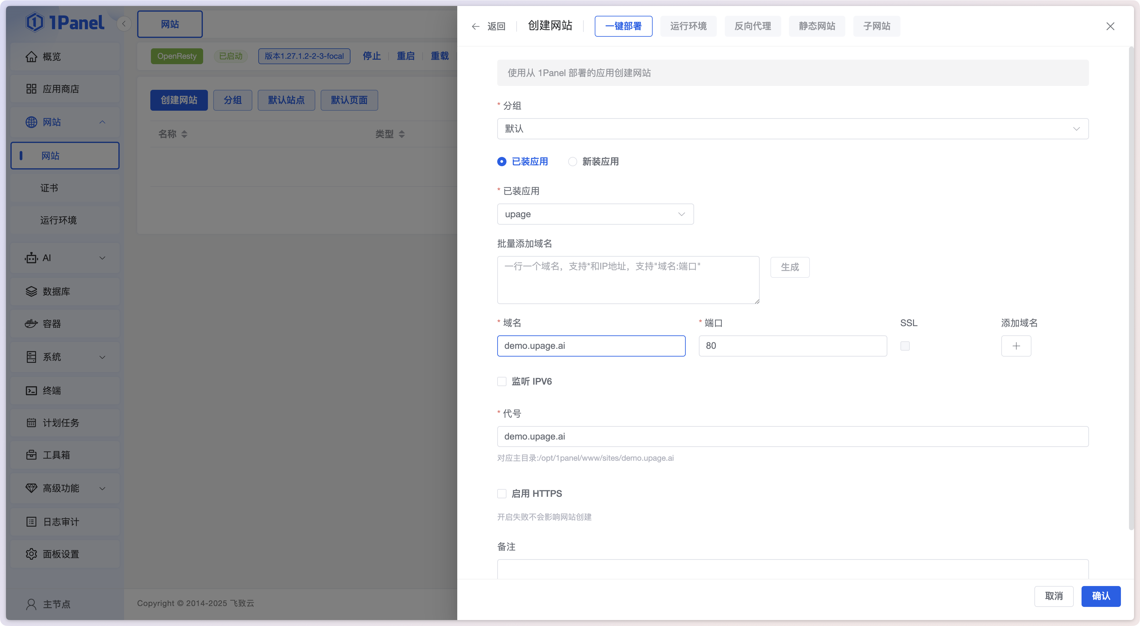 完成 UPage 应用的安装后,此时并不会自动创建一个网站,我们需要手动创建一个网站,然后将 UPage 应用绑定到这个网站上才能使用域名访问。