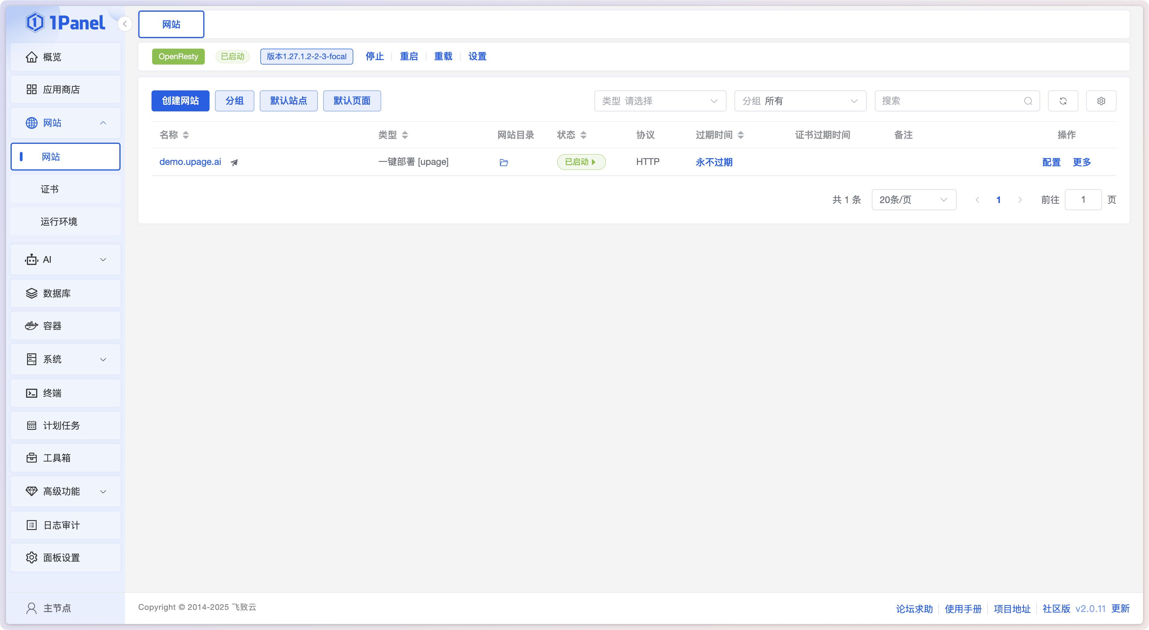 安装完成后,点击 1Panel 菜单的 网站,进入网站列表页,点击 创建网站 按钮。
